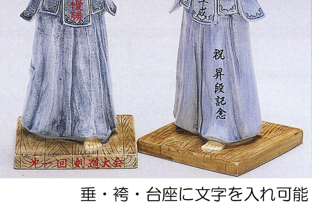 垂・袴・台座に文字を入れる事が出来ます。垂には「個人名」、袴には「座右の銘」、台座には「卒業記念品」などを入れてオリジナリティーある記念品に仕上げてください。